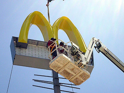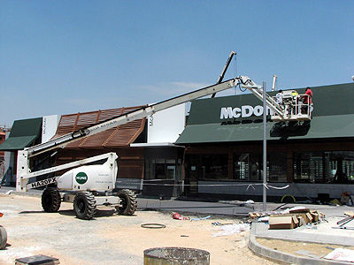La dificultad de los accesos y las distintas alturas que presentaban los trabajos del nuevo establecimiento de la cadena de restauración, hicieron necesario que la empresa Uno Signs Makers, encargada de la instalación de los nuevos soportes, alquilara dos plataformas articuladas Hune. La plataforma de 12 metros fue muy útil para la instalación de la marquesina exterior realizada en reinobond, un composite de aluminio para fachadas, y de los rótulos del establecimiento. La instalación del tótem de 16 metros se llevó a cabo con una plataforma articulada de 22 metros.