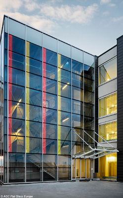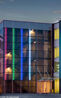 AGC con LEDs integrados (diodos luminosos alimentados por energía eléctrica). Esta hazaña tecnológica permite, gracias a un sistema informático, vestir de color la fachada en función de diseños con movimientos aleatorios o previamente programados. Los arquitectos del proyecto, Storme & Van Ranst, optaron por un diseño sobrio y elegante de líneas verticales. La selección cromática y la secuencia de la animación son el resultado de una estrecha colaboración entre el estudio de arquitectura y los ingenieros de