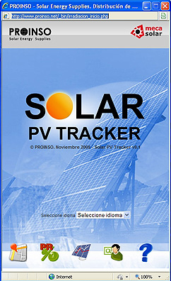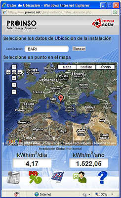 Funcionamiento: En 5 pasos 1.- La aplicación Solar PV Tracker comienza aportando los datos de radiación solar en cualquier parte del planeta, medida en kWh/m² (tanto diarios, como anuales), en el plano horizontal a 0 grados. Es posible localizar tanto un país o población, como seleccionar en el mapa una ubicación exacta en cualquier parte del mundo. Los datos de radiación solar se basan en diversas bases de datos, tanto privadas como públicas, entre ellas la de la Organización de Naciones Unidas.
