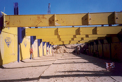 Monocodal de Patines , es habitual entibar zanjas de 6,20 m y más. La anchura de trabajo puede ser de en torno a 8 metros. Cuando hay que instalar tubos largos, de longitud superior a la distancia entre Monocodales, el sistema de