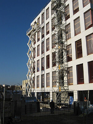 Para el revestimiento del edificio, se ha utilizado un cemento especial en color blanco, sin embargo, los operarios están tratando este material en la fachada para conseguir una textura más nítida y que no necesite de mantenimiento en el futuro.