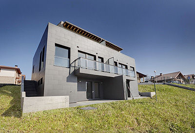 Estilo innovador El conjunto es estéticamente antagónico a las edificaciones habituales y de su entorno, donde imperan los diseños tipo "neo-caserío" o rústico. Estas viviendas no evidencian su sistema constructivo a simple vista, ya que los exteriores están resueltos por medio de una combinación de placas de hormigón polímero sobre perfil metálico (fachada ventilada) y enfoscado acrílico en el volumen superior. La edificación tiene un estilo diferenciado, contemporáneo y actual, ya que no existen límites a nivel de diseño. Cada una de las casas cuenta con 290 metros cuadrados construidos, distribuidos en tres alturas, más un espacio exterior de unos 300 metros cuadrados destinado a jardín y terrazas.