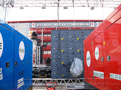 Estos grupos electrógenos de 200 kva alquilados a Hune dotaron de suministro eléctrico a las actividades paralelas que se celebraron en los alrededores del estadio murciano. Se instalaron varios stands publicitarios y un escenario adjunto para el sorteo de camisetas de la selección española entre los aficionados.