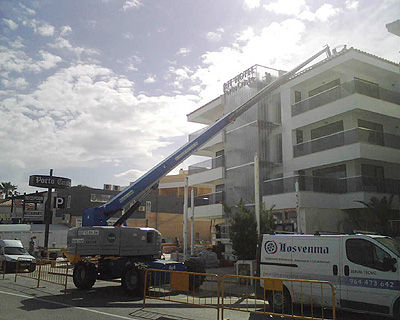 La dificultad de esta operación ha radicado en la proximidad del hotel con la playa. Por este motivo, la plataforma telescópica de 28 metros se colocó en la carretera de acceso al municipio para poder operar en los trabajos de pintura de la fachada y en la instalación de un muro cortina.