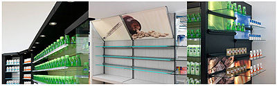 La línea de parafarmacia ofrece un completo conjunto de instalaciones adecuadas para productos de envases pequeños y ligeros: cosmética, herboristería, fitoterapia, homeopatia, suplementos nutricionales, etc. Está compuesta por expositores de pared, cajoneras profesionales, estantes con bandejas extraíbles y distintas soluciones que ofrecen la máxima visibilidad. Además ofrece la posibilidad de introducir paneles informativos y diferentes iluminaciones que facilitan al consumidor la identificación inmediata del trastorno de salud tratado y de las distintas soluciones propuestas. El equipamiento se minimiza hasta lo esencial para lograr la máxima visibilidad del producto, en los distintos planos de vidrio transparentes que permiten mostrar toda la información de sus envases.