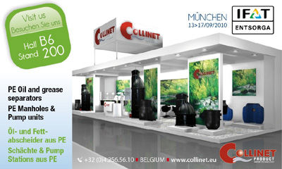 Collinet, firma especializada en el pretratamiento de las aguas, asistirá del 13 al 17 de septiembre en Munich a la feria líder internacional en gestión de aguas, aguas residuales, residuos y materias primas secundarias, IFAT 2010. Una gran oportunidad para Collinet que presentará su amplia gama de productos a los visitantes de la feria.