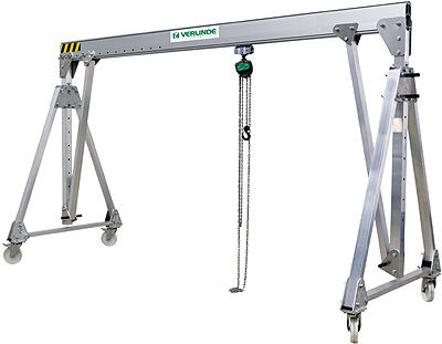 Pórtico ALU tipo VGPA , es una gama de pórticos ultraligeros con desplazamiento manual para cargas de 250 a 2.000 kg. Pueden desplazarse de un punto a otro, ofreciendo así una excelente alternativa a los sistemas de elevación fijos. Con ello se facilita la labor de los servicios de mantenimiento y los equipos de montaje a la hora de realizar las operaciones de instalación, desinstalación, y colocación de piezas y componentes. La gama