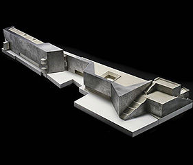 "un muro vegetal" , profundo y ligero, que se apoya en la diferencia topográfica existente, y que oculta en su interior dos pabellones que albergan las salas de exposición.