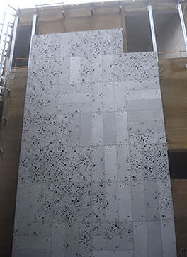 La fachada se ha diseñado mediante la colocación de marcos de acero en los que van premontadas desde el taller las chapas de aluminio correspondientes, que luego hay que colocar en un determinado orden según el dibujo que los arquitectos han previsto.