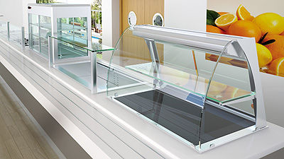 Destacan especialmente las nuevas vitrinas expositoras que pueden ser instaladas individualmente o en conjunto con otros elementos Drop-In de Edesa Hostelera. El diseño de las vitrinas ha sido estudiado para ofrecer la máxima exposición y visibilidad del producto utilizando cristales curvos templados y elementos de iluminación y calefacción para mantener la comida a la temperatura adecuada de servicio.