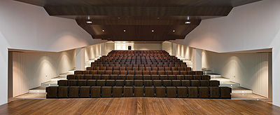 Esta butaca diseñada por el propio arquitecto de la obra y desarrollada por Figueras, se adapta perfectamente a las exigencias del proyecto y a la modernidad que se ha querido plasmar en este edificio como una nueva pieza junto al edificio histórico. Sus marcadas características funcionales como de diseño (las carcasas del asiento son de madera y cerrada se asemeja a un bloque compacto perfectamente encajado) otorgan a la sala una máxima optimización del espacio debido a sus dimensiones. El movimiento de cierre del asiento ha sido diseñado con la aplicación del sistema de amortiguación "Soft System" de Figueras que evita golpes y ruidos molestos.