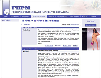 La Federación Española de Pavimentos de Madera (FEPM) ha activado en su página web ( www.fepm.es) la sección "El Técnico Responde"; un foro de consulta y debate donde cualquier persona puede plantear sus preguntas o contar sus experiencias acerca de los suelos de madera.
