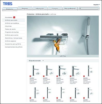 Consciente de la importancia de esta pagina web, Tres ha decidido renovarla con un diseño más atractivo y ampliarla para dar más contenidos, más facilidad de uso y mas información al usuario. La rapidez en encontrar un producto para los usuarios, la solución de problemas de montaje para el instalador, las atractivas promociones para el cliente, son elementos que generan satisfacción entre los internautas y consiguen así convertir esta página web en un punto de referencia dentro el sector de la grifería.
