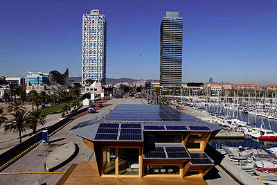 Pabellón solar en el Puerto Olímpico de Barcelona Ya se puede admirar un ejemplo de este planteamiento de producción urbana: un pabellón solar en el Puerto Olímpico de Barcelona. Este edificio de madera se construyó en tan solo un mes con ocasión del congreso Smartcity. Sus diferentes segmentos fueron proyectados digitalmente y fabricados en un corto espacio de tiempo mediante "Rapid Manufacturing", a pesar de la gran diversidad de formas y tamaños a realizar. El pabellón fue diseñado por el Instituto Avanzado de Catalunya y promovido por la empresa Visoren por encargo de Endesa (Empresa Nacional de Electricidad). Con 25 millones de clientes, esta compañía energética y de servicios es un peso pesado dentro de su sector y ha llevado ya a cabo la gestión energética del proyecto "Smartcity Málaga". Endesa va a implementar también el correspondiente sistema "Smartgrid" para el suministro energético ahorrativo y respetuoso con el clima en las ciudades Barcelona y Búzios (Brasil).