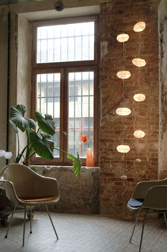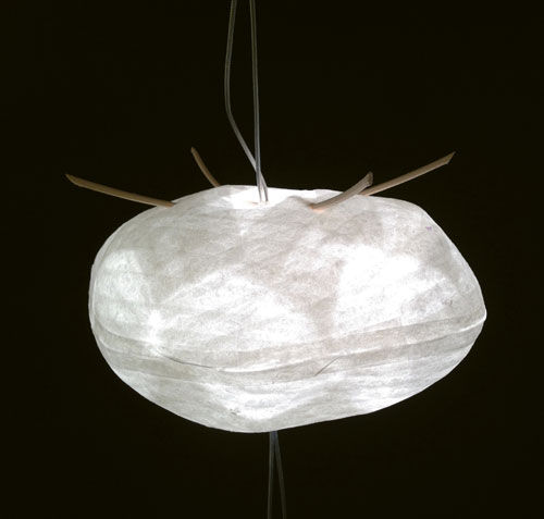 La luminaria de techo Courant d'Air consta de cuatro capullos de Washi (papel japonés), cada uno diferente en cuanto a forma y textura y sujetados mediante dos astas de madera de rattan.