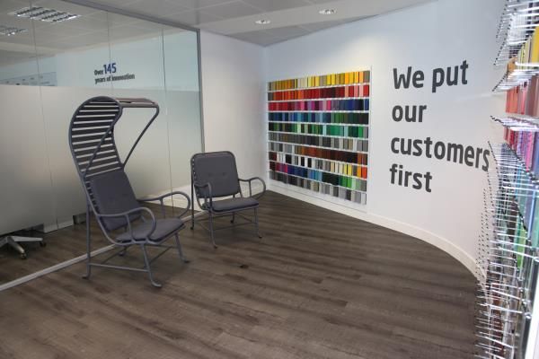 En la sala de exposición de recubrimientos en polvo, los visitantes de las oficinas pueden ver ejemplos de todos los colores RAL que las marcas de pintura en polvo de Alesta® de