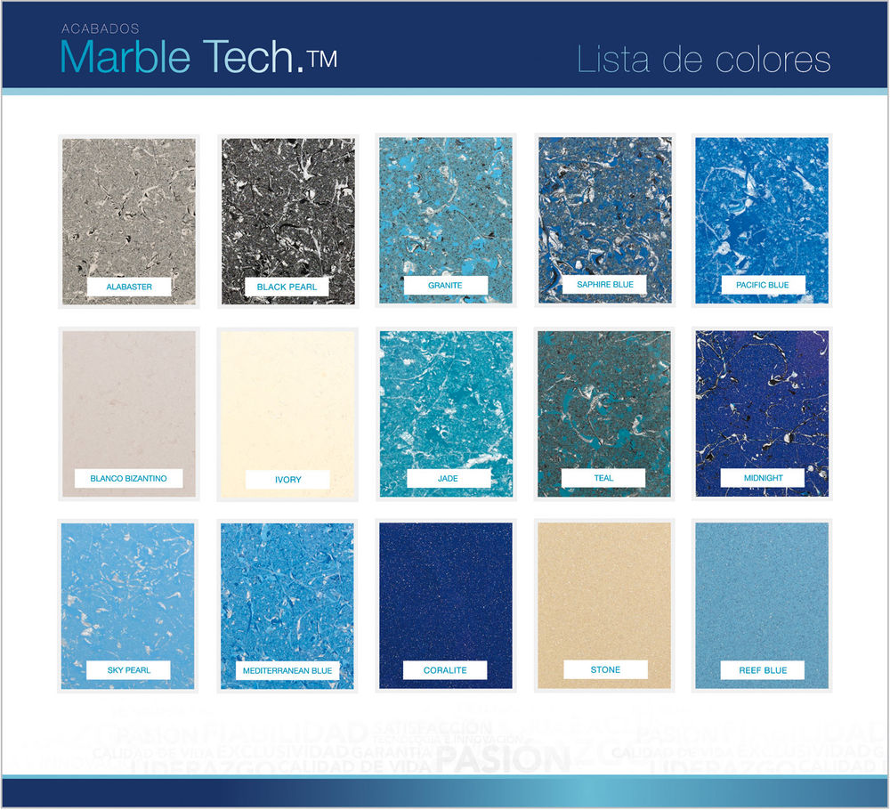 Freedom Pools ofrece diseño de vanguardia, y una gran variedad de colores, formas y tamaños. La empresa tiene la exclusividad en los acabados "Marble Tech", tecnología basada en una terminación de gelcoat de alta calidad que mejora visual y estructuralmente su instalación. Este sistema, que ha revolucionado la industria del poliéster, dispone de 17 colores que van desde el azul del Mediterráneo al de los brillantes cristales de jade.