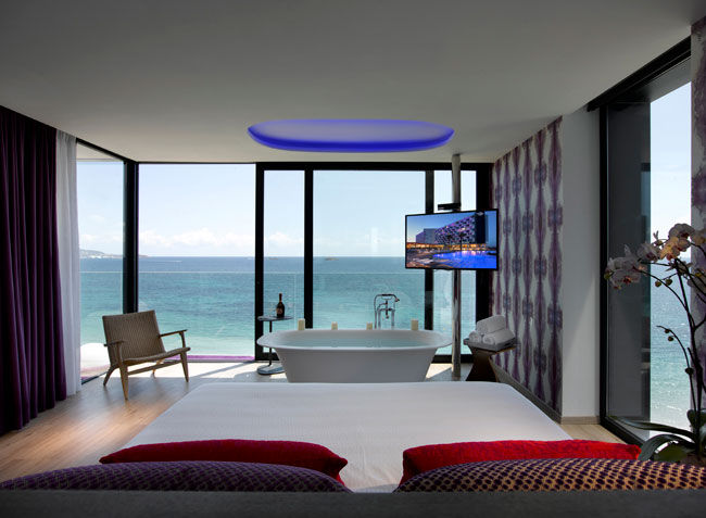 Estudio b76. Cada habitación junior suite del actual Hard Rock Hotel, fue en su día habitación y media del antiguo hotel tres estrellas. Desde su interior, en cualquier punto, se puede observar el mar. Los jacuzzis se sitúan en la terraza acristalada, como si nos bañáramos en el mismo mar Mediterráneo que estamos viendo.