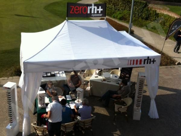 Desde hace algún tiempo, Zero RH+ está presentando su nueva colección de gafas en eventos realizados en un célebre club de golf. El objetivo es convencer a un público muy exigente de la calidad del producto y de su bella estética. Para su promoción Zero RH+ ha confiado en las carpas plegables Mastertent. Para la ocasión se ha personalizado una carpa con cubrepuntales con una discreta estampación en los faldones integrándose perfectamente a la atmosfera de los campos de golf y con un banner en su techo para dar mayor visibilidad a la marca.