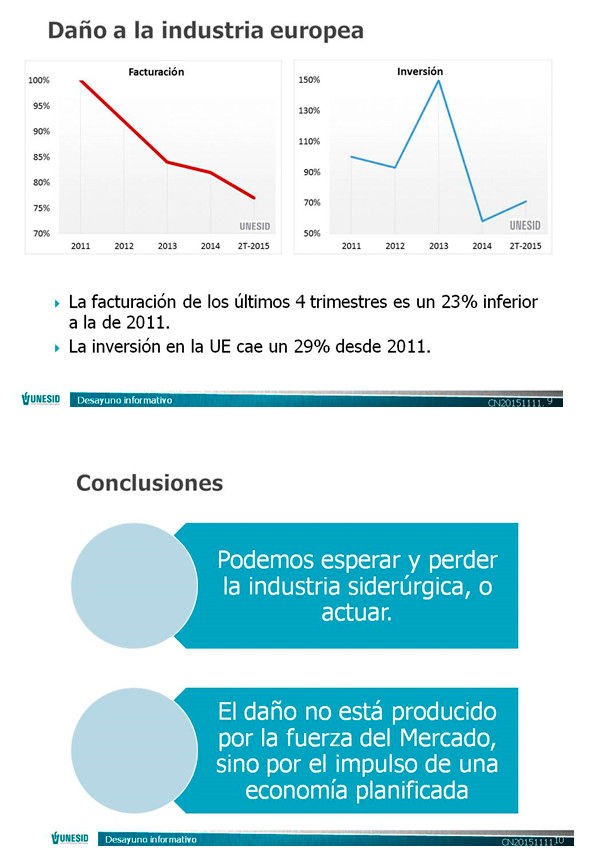 Gonzalo Urquijo , presidente de UNESID, "nuestra industria no quiere subvenciones ni ayudas que distorsionen el libre mercado. Estamos acostumbrados a competir y exportamos a todo el mundo; lo único que exigimos es que la competencia se haga en términos de competencia leal y no amparada por ayudas de estado o intervenciones gubernamentales, como ocurre ahora con las empresas chinas".