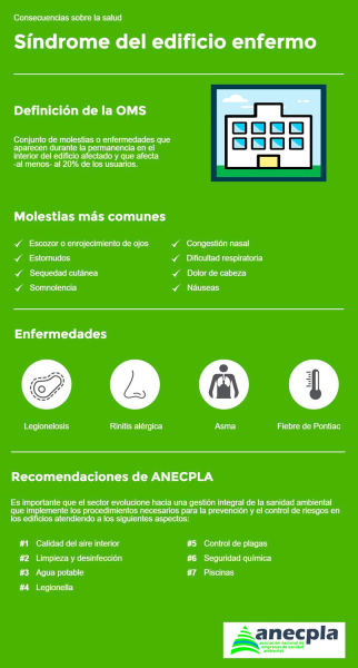 ANECPLA , la Asociación Nacional de Empresas de Sanidad Ambiental, reclama un modelo integral de sanidad ambiental que amplíe la gestión y la prevención de riesgos en todo tipo de edificios, tanto privados como públicos. La contaminación de ambientes interiores de los edificios es un factor determinante en la salud y bienestar de sus usuarios. El objetivo prioritario debe ser lograr el desarrollo saludable y sostenible de los mismos, mediante la implantación de Sistemas de Gestión Integral de la sanidad ambiental para generar edificios saludables.