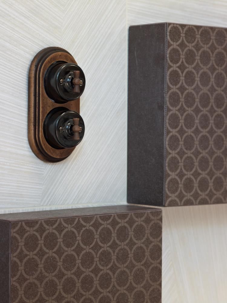 Foto: Interruptor rotativo Garby de Fontini acabado porcelana negra con marco de madera. CARACTERÍSTICAS TÉCNICAS Diseño: equipo Propio.