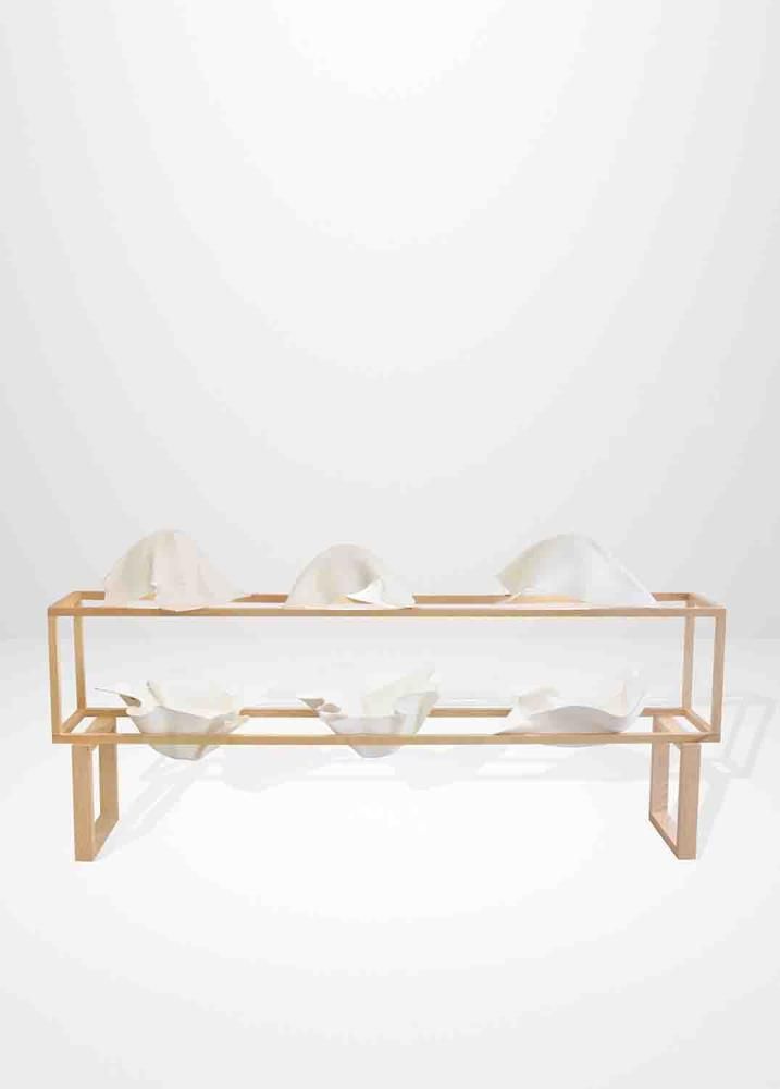 Mediterráneo: Aparador de madera de castaño y seis piezas con forma orgánica realizadas en piedra acrílica HIMACS® con led en las piezas superiores. Esta escultura hace referencia a la inmigración. Los cuencos de la parte inferior representan a las personas que están atrapadas en la pobreza y los de la parte superior son las personas que tienen la luz, la capacidad de ayudarles.