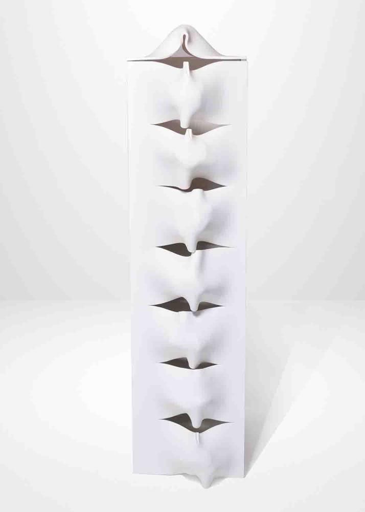 Ixil-ixilik: Aparador de madera lacada con puertas y encimeras realizadas en HI-MACS®. Ixil-ixilik significa ‘calladito’ y defiende la libertad de expresión. La parte realizada en piedra acrílica representa bocas que no pueden abrirse con facilidad para hablar de cualquier tema. Sin embargo, al tratarse de un armario, se puede abrir, por lo que muestra el lado positivo: todos podemos hablar y opinar.