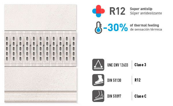 Cerámica Mayor ofrece un acabado súper antideslizante R12 con un grabado especial para mantener la seguridad en las zonas húmedas de terrazas, piscinas y spas