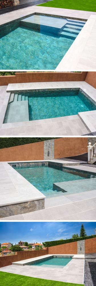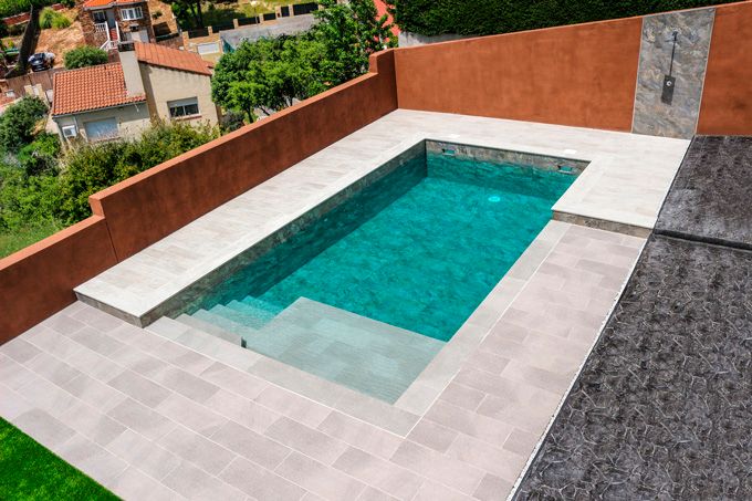 Un vez más tenemos un claro ejemplo de las soluciones de Cerámica Mayor para vaso de la piscina, donde se utiliza la serie Stromboli Silver para el borde, escaleras y banco de sol. Esta serie se utiliza de manera inteligente para fusionar el entorno de la piscina y revestimiento del vaso realizado con Sea Rock Gris Oscuro, que genera multitud atípicos y elegantes tonos de azul. Como coronación y cambio de desnivel de la parcela se utiliza Rainforest blanco que da el punto de luz al conjunto.