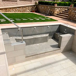 Con el sistema de piezas especiales de Cerámica Mayor podemos cubrir las necesidades de cualquier tipo de piscinas. Logrando un revestimiento del vaso 100% de la misma serie, lo que quiere decir, que el interior del vaso quedará de un color totalmente uniforme y natural. Tienen soluciones para desniveles, bancos de sol o jacuzzi y su última aportación un sistema de piezas para limpiafondos que facilitan la limpieza del interior del vaso, este sistema lo llaman "Media Caña"