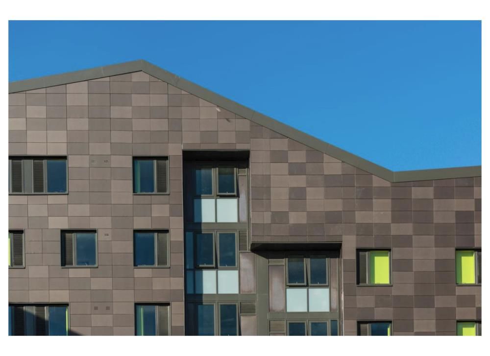 La combinación de colores de la paleta Tempio le da al conjunto un aspecto recreativo y natural al mezclarse con la configuración de color del campus. El uso del sistema de fachada ventilada FS-20 en combinación con otros elementos aislantes facilita el ahorro de energía y la sostenibilidad.