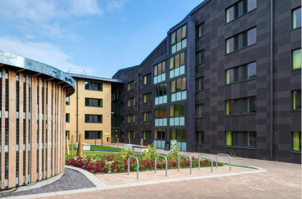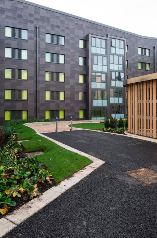 La residencia de estudiantes de Quads se divide en dos edificios, con 708 habitaciones dispuestas como pisos para grupos y un refectorio con capacidad para 350 personas, llamado The Lime Tree. El éxito del resultado en Quads ha llevado a un concepto de diseño similar en pisos de grupo y grandes espacios comunales.