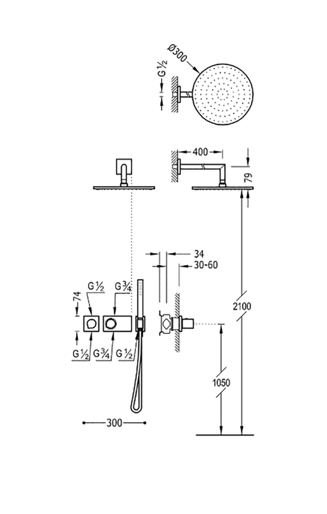 · Ducha fija Ø 300 mm. con rótula. Material Latón.