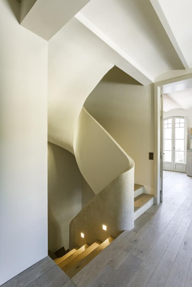 La vivienda, dividida en 4 pisos, se distribuye a través de la escalera, que se concibe como un elemento escultórico y funciona como núcleo central de la casa. En la planta baja se organiza según la composición tradicional, hall, cocina con lavadero, sala de estar y comedor. En la primera y segunda planta, a ambos lados de la escalera, se accede a través de grandes puertas a las distintas habitaciones. Los servicios, situados también en ambas plantas, se esconden en unas cajas de madera lacada rallada imitando las bovedillas de los forjados, cuyo panelado exterior camufla la verdadera identidad del espacio y ofrece un carácter de un simple armario. Finalmente, en la tercera planta se accede al estudio que comunica con una gran terraza con vistas a la montaña del Tibidabo y a los jardines colindantes. Un espacio bañado por la luz natural que entra a través de grandes ventanales.