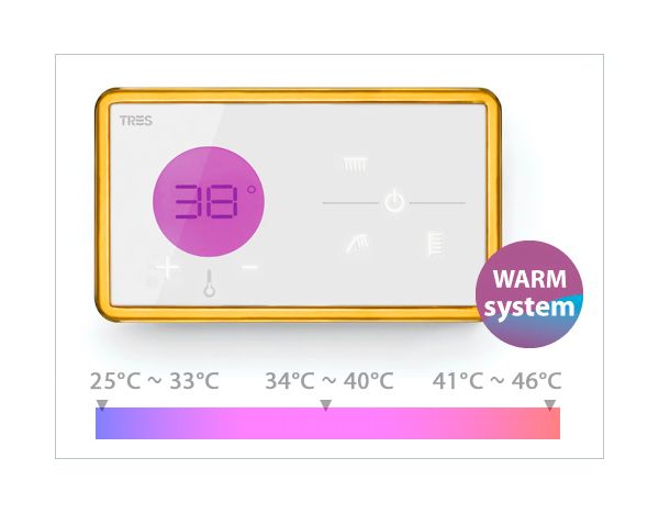La pantalla muestra mediante números, colores e íconos las distintas opciones con las que cuenta este sistema. Tal es el caso de la tecnología "Warm System" (la función que permite saber cuando el agua ha alcanzado la temperatura que ha seleccionado la persona que va a ducharse o bañarse).