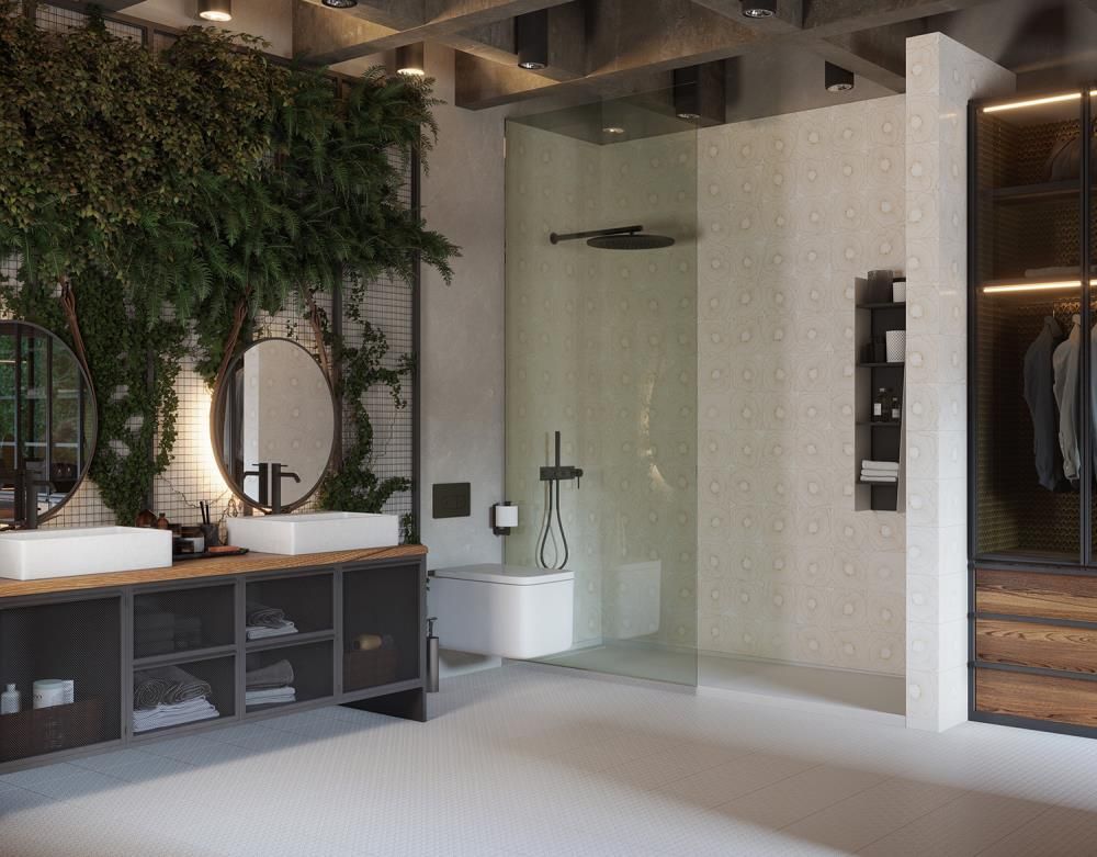 Espacio con revestimiento Art-Deco Black Spritz Natural de Aparici y en el pavimento Art-Deco Black combinado con Black Negroni Natural LA FIRMA Cerámicas Aparici representa la más alta calidad de fabricación con diseños innovadores y únicos.