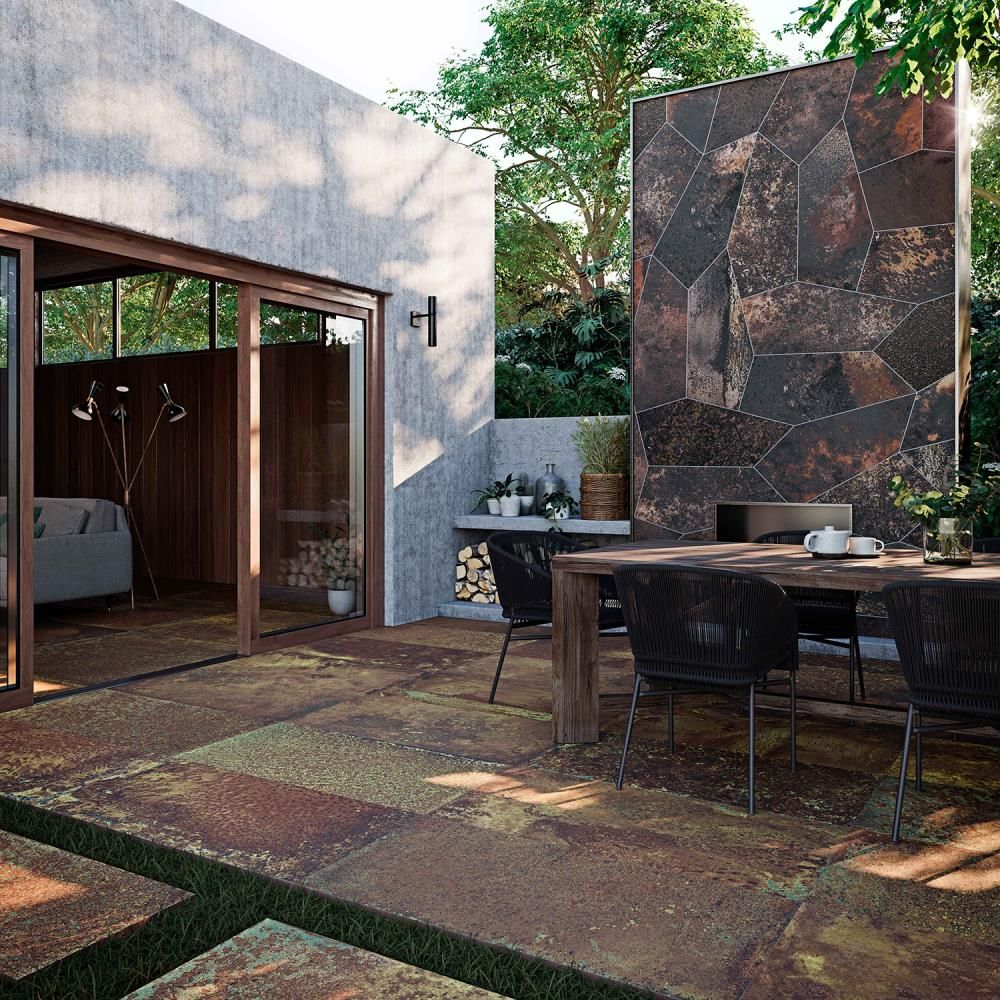 Pavimento 2cm outdoor Corten Oxidum de Aparici. En esta imagen podemos observar la continuidad visual de pavimento desde el interior hacia el exterior. Renovar y dar un acabado impecable a los proyectos exteriores más actuales es fácil con