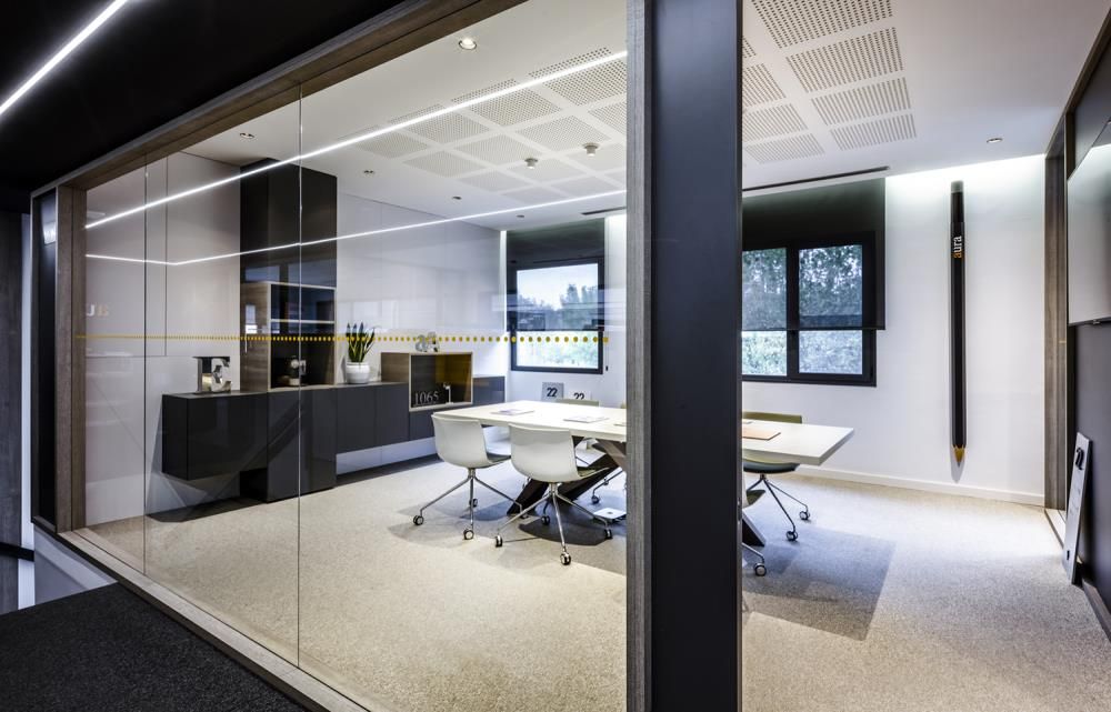 Delante de la mesa principal, colocamos una mesa de juntas, 90 cm de altura para reuniones informales. Decidimos colocar los
