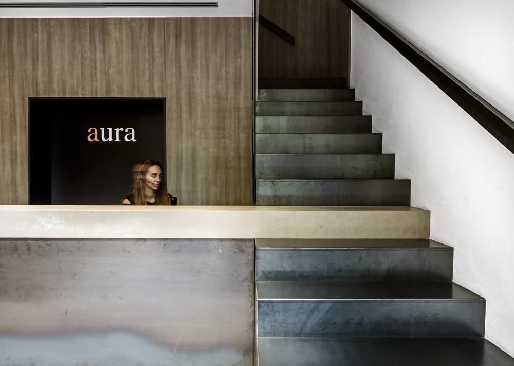 Siguiendo con esta doble lectura de cada uno de los elementos diseñados para AURA, decidimos unir la pared de la recepción con la pared donde está colocado el banco mediante una pieza metálica lacada en los mismos tonos.