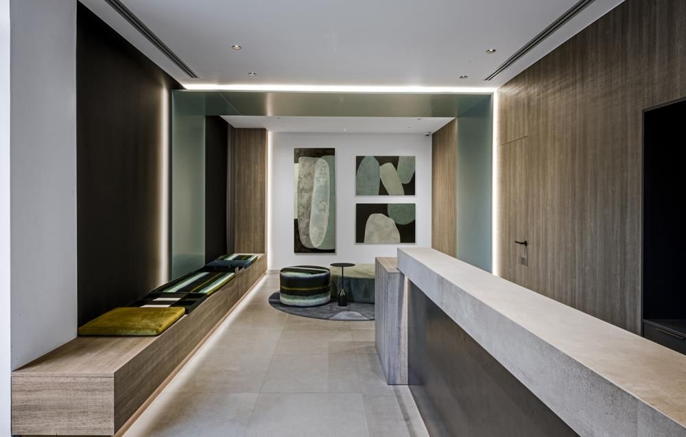 recepción y la sala de espera de clientes. Creamos un espacio visualmente conectado entre sí a través del propio mobiliario diseñado a medida para este proyecto.