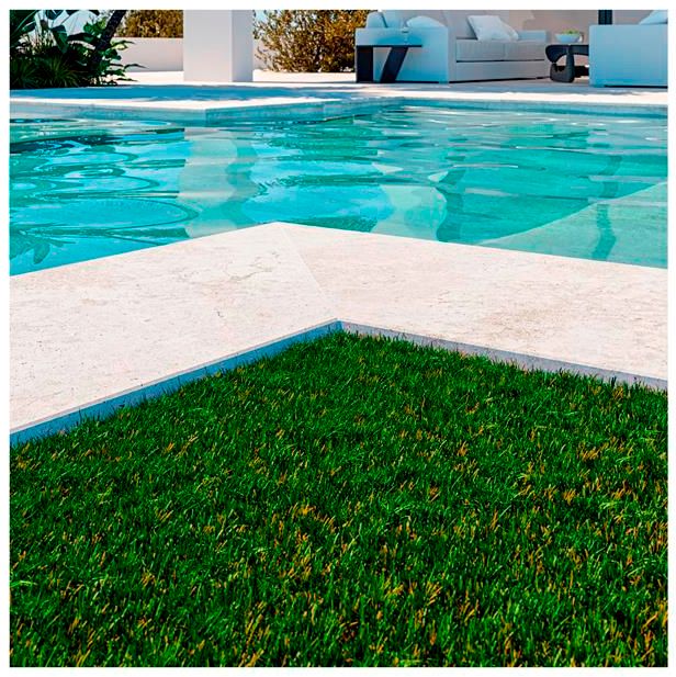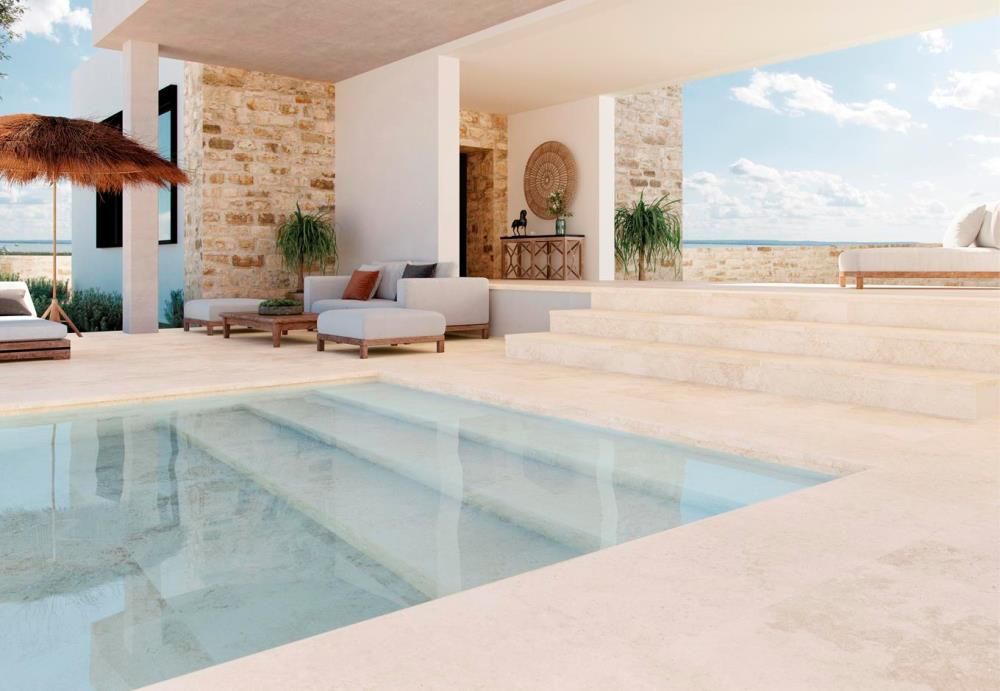 El espacio queda completamente integrado con sus posibilidades para interior, terrazas y piscinas, en un mismo estilo que reproduce el color y la textura de una piedra maravillosa y orgánica como lo es el travertino.