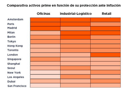 programa de análisis inmobiliario global Impacts, de Savills − los activos inmobiliarios terciarios en Europa tienen una mejor cobertura ante la inflación que los ubicados en Norteamérica o Asia-Pacífico. Los activos logísticos europeos destacan especialmente por la fuerte demanda subyacente. La ciudad europea más resiliente en oficinas, logístico y retail es Ámsterdam. Madrid también está en buena posición frente a otras ciudades por su mejor cobertura ante la inflación especialmente en oficinas y retail tradicional (centros y parques comerciales).