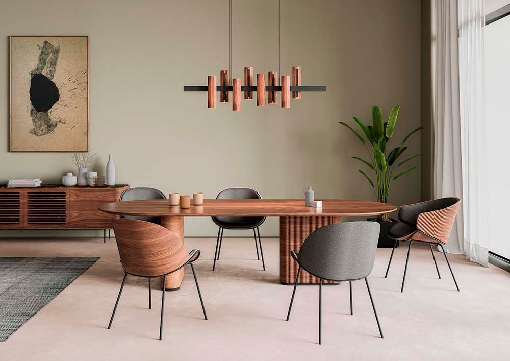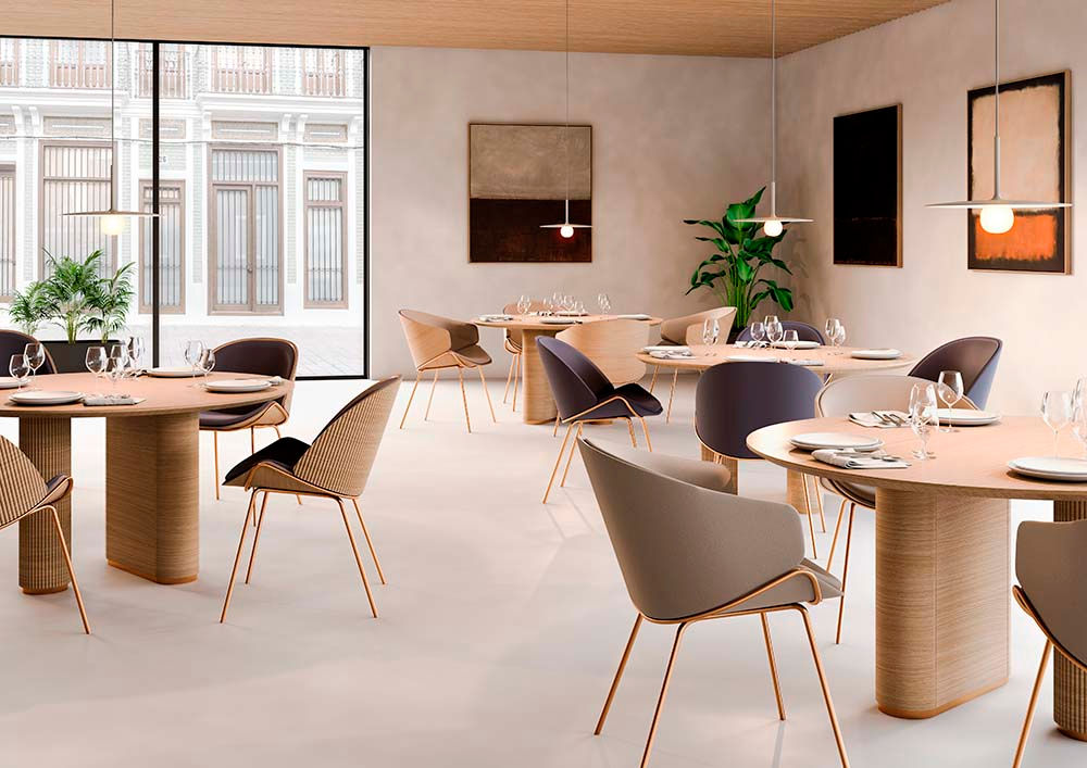La colección incluye mesas de madera natural cuyo diseño integra dos patas perpendiculares, una transversal y otra longitudinal, que no llegan a tocarse. Su superficie puede ser de madera o porcelánico Dekton by Cosentino®, un material de alta calidad poco utilizado en el ámbito del mobiliario.