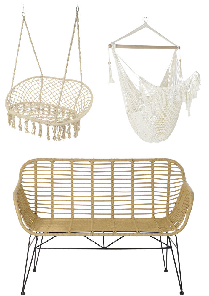 La colección CALMA está diseñada para decorar los espacios de exterior con estilo y está compuesta por sillones, mesas de apoyo, sofás, tumbonas, sillas colgantes, sillones balancín y hamacas de macramé. El material utilizado para su fabricación es el yute, ratán sintético 100% ecológico (no se ve afectado por las temperaturas extremas, no se agrieta, divide ni se estira cuando se moja), el metal y el macramé.