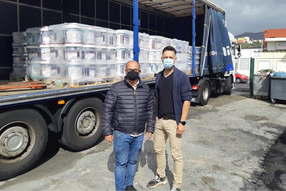 (A la izquierda) Francisco Leal, Concejal de Obras del Ayto. de Los Llanos de Aridane, recibiendo los más de 3.000 litros de pintura donados por AkzoNobel, (a la derecha) Manuel Hdez. Martín, Responsable del Centro Procolor Higinio Tabares e Hijos,S.L en La Palma. AkzoNobel , la compañía líder en la fabricación y venta de pinturas y recubrimientos de alta calidad, ha querido contribuir a través del color en las labores de reconstrucción de la localidad de los Llanos de Aridane, tras la erupción del volcán de Cumbre Vieja, en La Palma. Por medio de la marca profesional Procolor, la compañía ha hecho entrega de 18 palets de pintura, equivalentes a más de 3.000 litros, destinados a la reforma de los barrios y viviendas afectadas de la localidad.