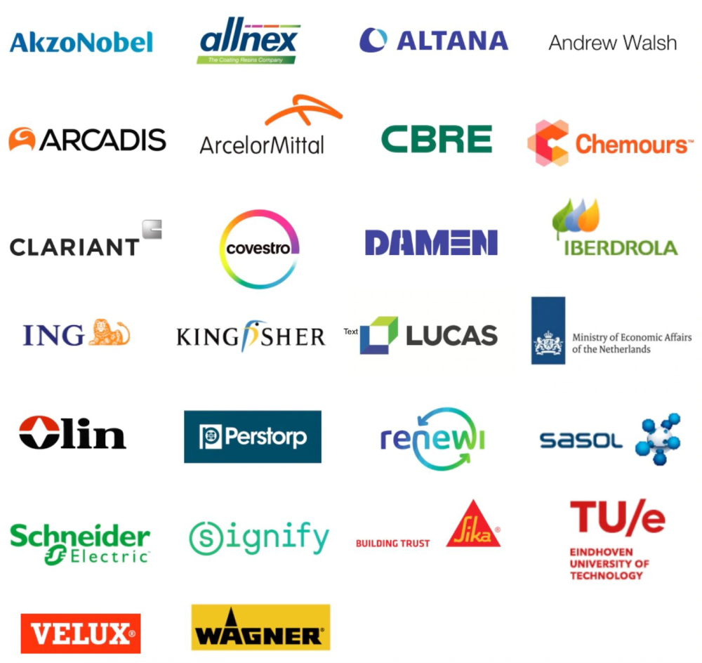 socios que asistirán se encuentran: Allnex, ALTANA AG, AW Repair Group, Arcadis, ArcelorMittal, CanPack, CBRE, Chemours, Clariant, Covestro, astilleros Damen, Iberdrola, ING, Kingfisher, Lucas Group, Ministerio holandés de Asuntos Económicos y Política Climática, Olin, Perstorp, Renewi, Sasol, Schneider Electric, Signify, Sika, Eindhoven University of Technology, Velux, Wagner y el World Green Building Council.