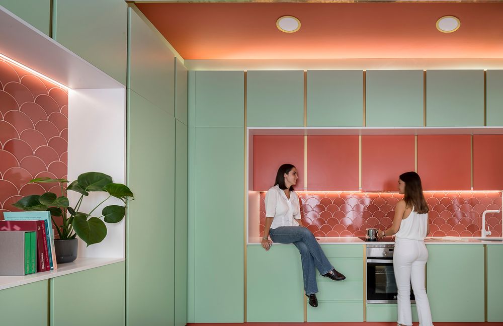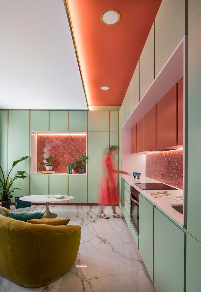 En dos de las paredes del espacio único, se abrieron dos grandes rectángulos que se revisten con las escamas cerámicas de color coral. Estas piezas se enmarcan en dos armariadas color menta que envuelven la nueva vivienda. Los paños de escamas cerámicas se han colocado intencionadamente frente a las ventanas para que la luz natural se refleje en ellos y aumente la intensidad.