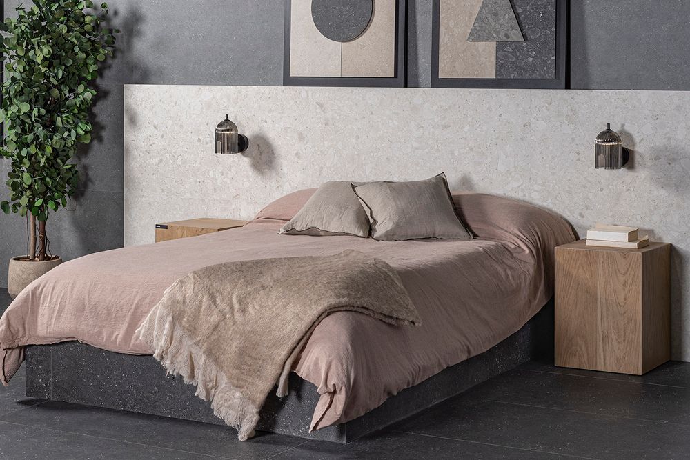 Argenta da un salto en el interiorismo y va más allá del uso tradicional y la utiliza como cabecero de un dormitorio, formando parte del mobiliario de nuestro hogar y en perfecta combinación con el pavimiento utilizado. En el dormitorio se muestran las series Kalksten y Flodsten, de colores neutros y acabado mate, series que han sido creadas para proyectos que buscan sencillez y elegancia.