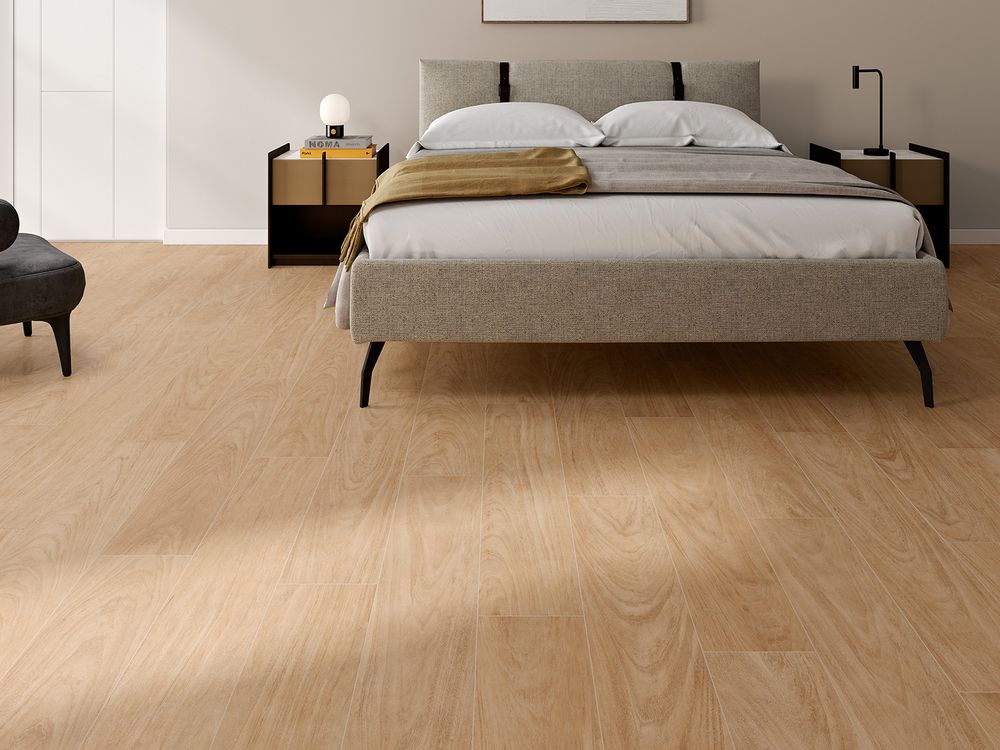 Por ello, propone un dormitorio reparador y muy cuidado, con una gama de colores cálidos que nos transmiten calma y tranquilidad. La madera Sangha (de la serie Artech, 20*120 cm) tiene un color miel que nos inspira equilibrio. En esencia, nos transmite una estética cálida y muy reconfortante en donde recogernos para descansar.